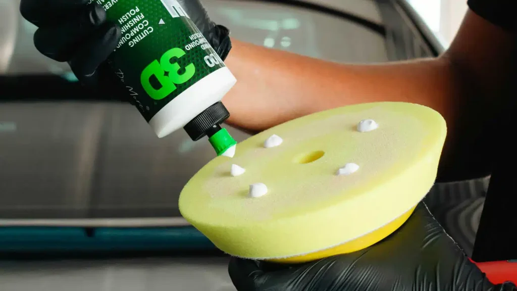 - Компаундиране: В тази стъпка се използва абразивен компаунд /Heavy Cut B9.01/ с полираща машина и твърда гъба /Koch Chemie Heavy Cut Pad/, за да се премахнат значителни дефекти. Компаундирането е най-агресивният етап и изисква опит, за да се избегне увреждане на лака.