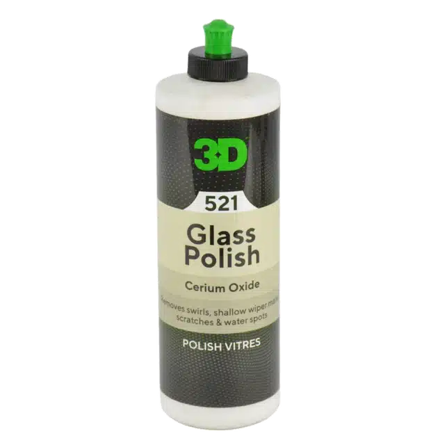 3D Glass Polish е средство за полиране на основата на цериев оксид, предназначено за премахване на завихряния, драскотини, следи от чистачки и водни петна от автомобилни стъклени повърхности. Нашата уникална формула е лесна за използване, като изисква минимално смазване на лактите за нанасяне и изтриване, като същевременно осигурява превъзходна визия и яснота „като нова“.
